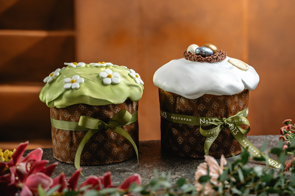 В Restaurant № 13 приготовили кулич на закваске аля панеттоне: в состав входят фисташка, вяленая вишня, черешня, клюква, молочный шоколад, сверху выкладывают маршмэллоу. Верхушку кулича украшают гнездо из шоколада с вафельной крошкой, шоколадные яйца и печать № 13 из белого шоколада. Вес кулича составляет 1 килограмм 100 граммов. Стоимость 6900 рублей.