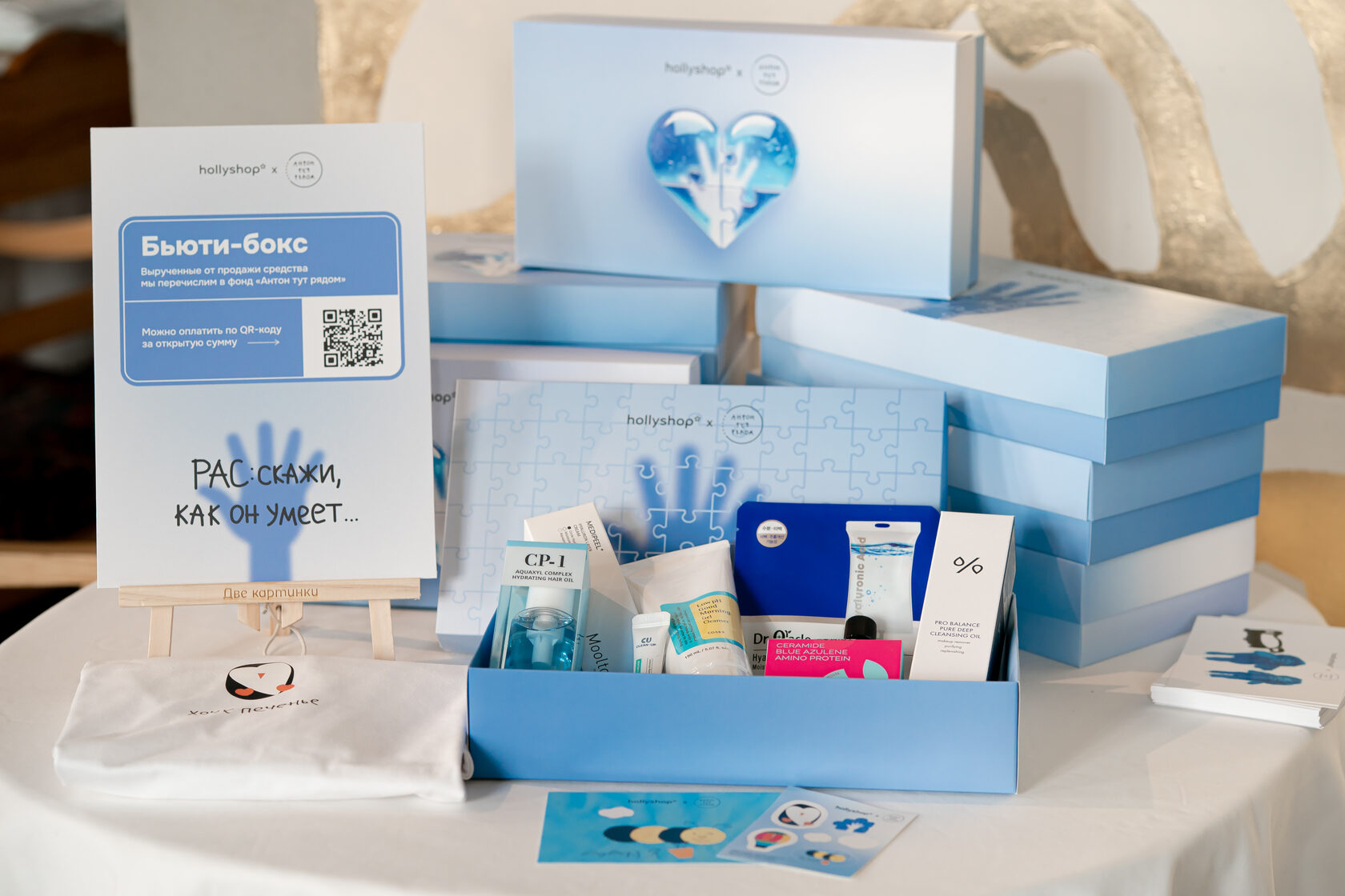 Команда hollyshop подготовила для гостей лимитированные боксы. Их можно было приобрести за открытую сумму, оформив пожертвование на сайте «Антон тут рядом» для развития проектов фонда.