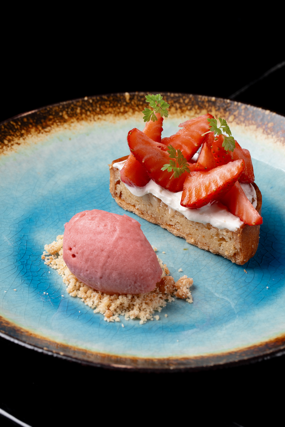 Клубничный дуэт азиатского ресторана Sintoho задуман как финальный штрих к легкой летней трапезе. Идеальным завершающим аккордом могут стать и клубничная тарталетка, и нарядный миндальный франжипан, который сервируют с шантильи с сычуаньским перцем, домашним ягодным сорбетом и свежей клубникой (880 руб).